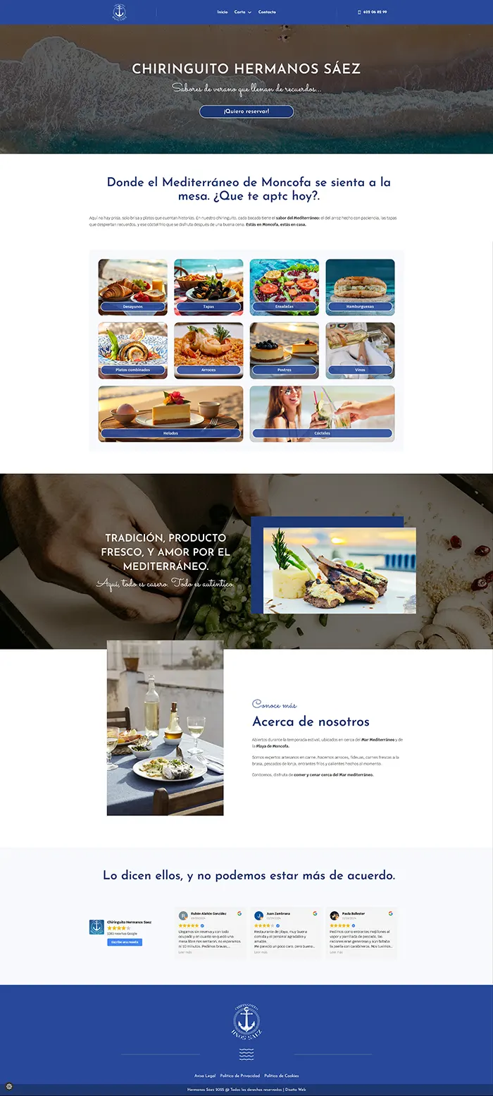 El chiringuito Hermanos Sáez necesitaba una web corporativa para toda su carta de productos. Un proyecto elegante y al mismo tiempo fresquito, buenas fotos para que la comida te entre por los ojos e ir a visitar este fantástico chiringuito cuando estás de vacaciones.