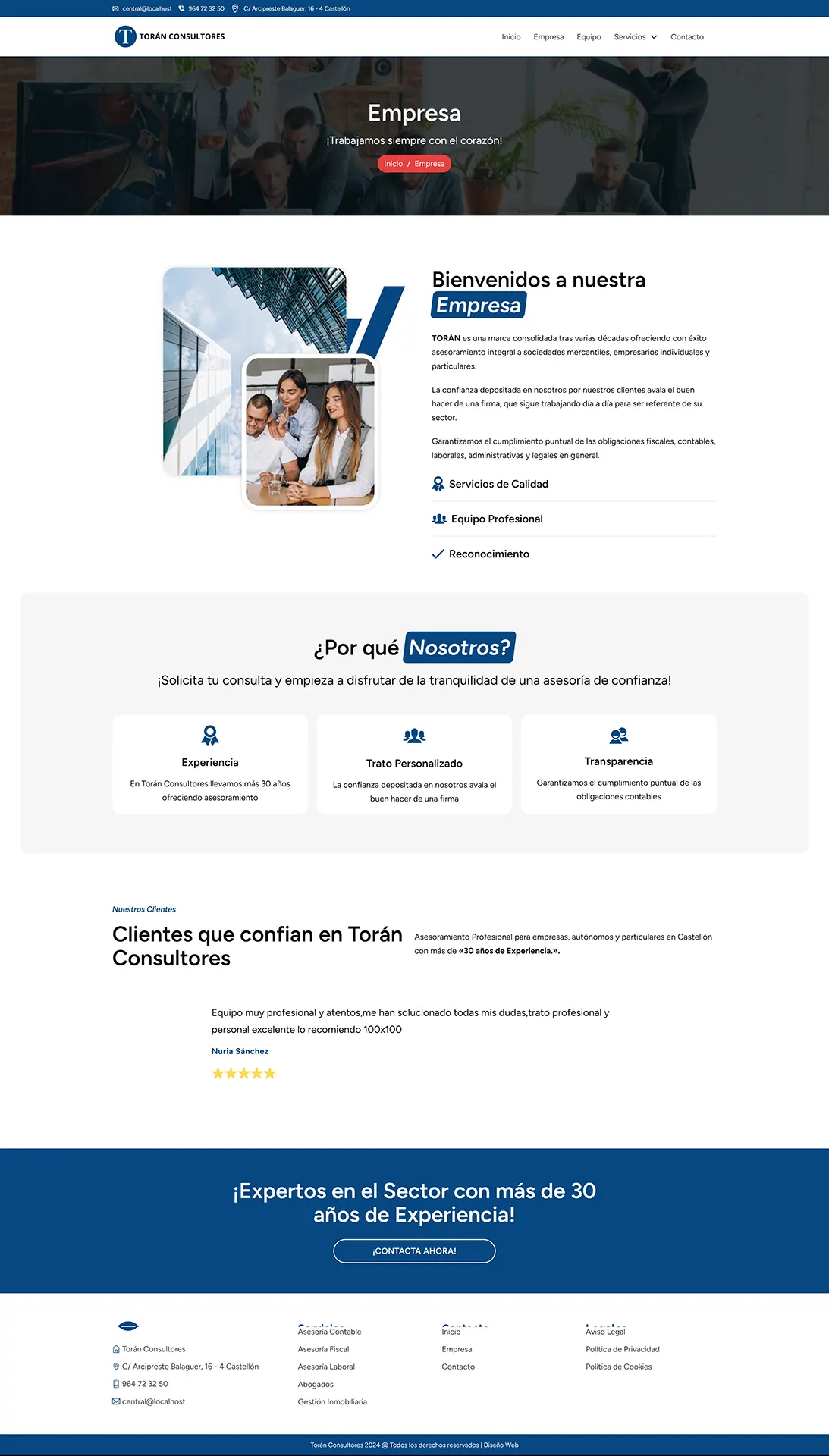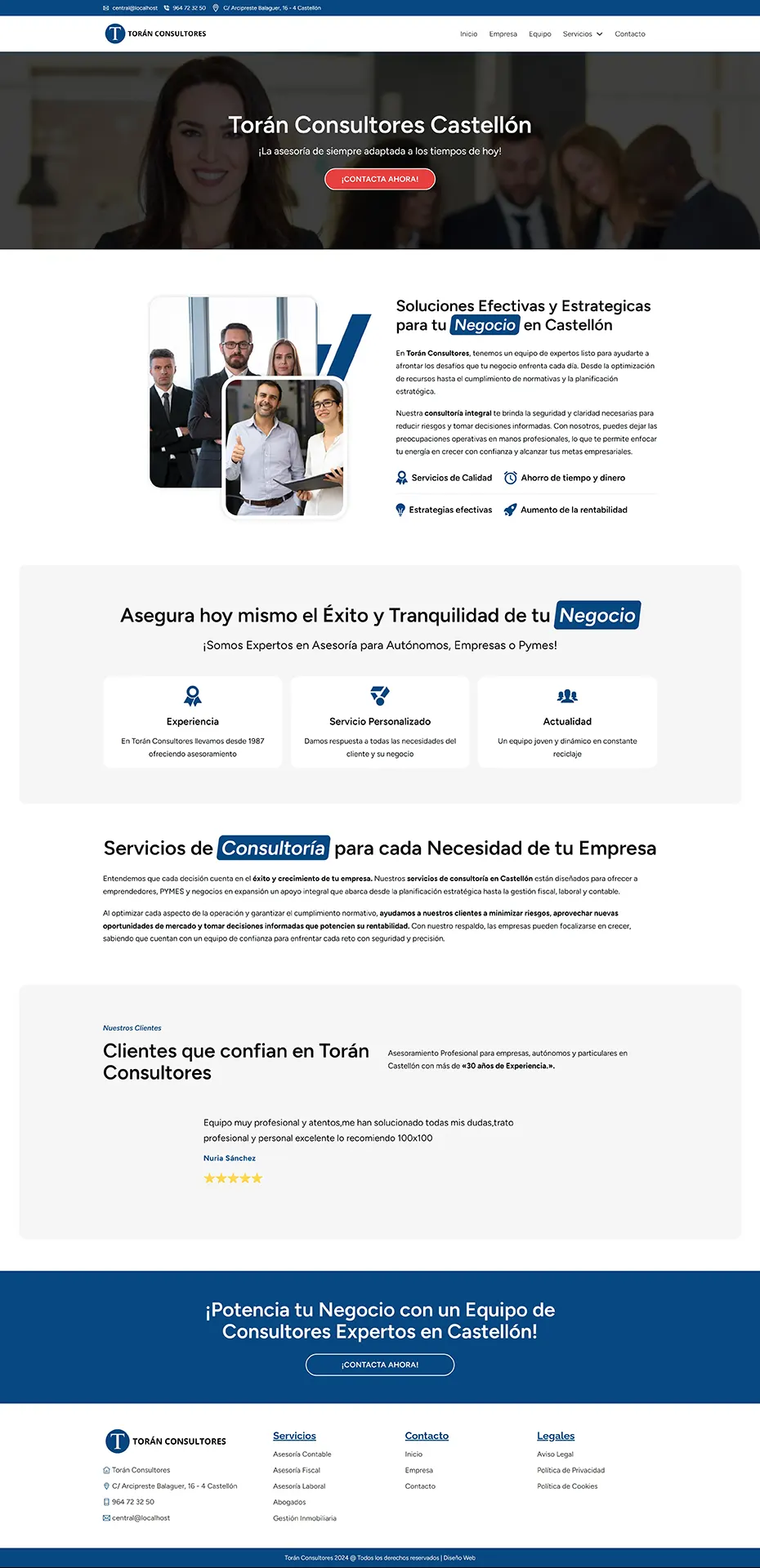 Torán Consultores necesitaba una web corporativa para presentar sus servicios de Gestoría y Asesoría en Castellón. Una web muy definida en su color corporativo y con textos muy elaborados enfocados a su casuística en servicios para particulares, autónomos, empresas y pymes.